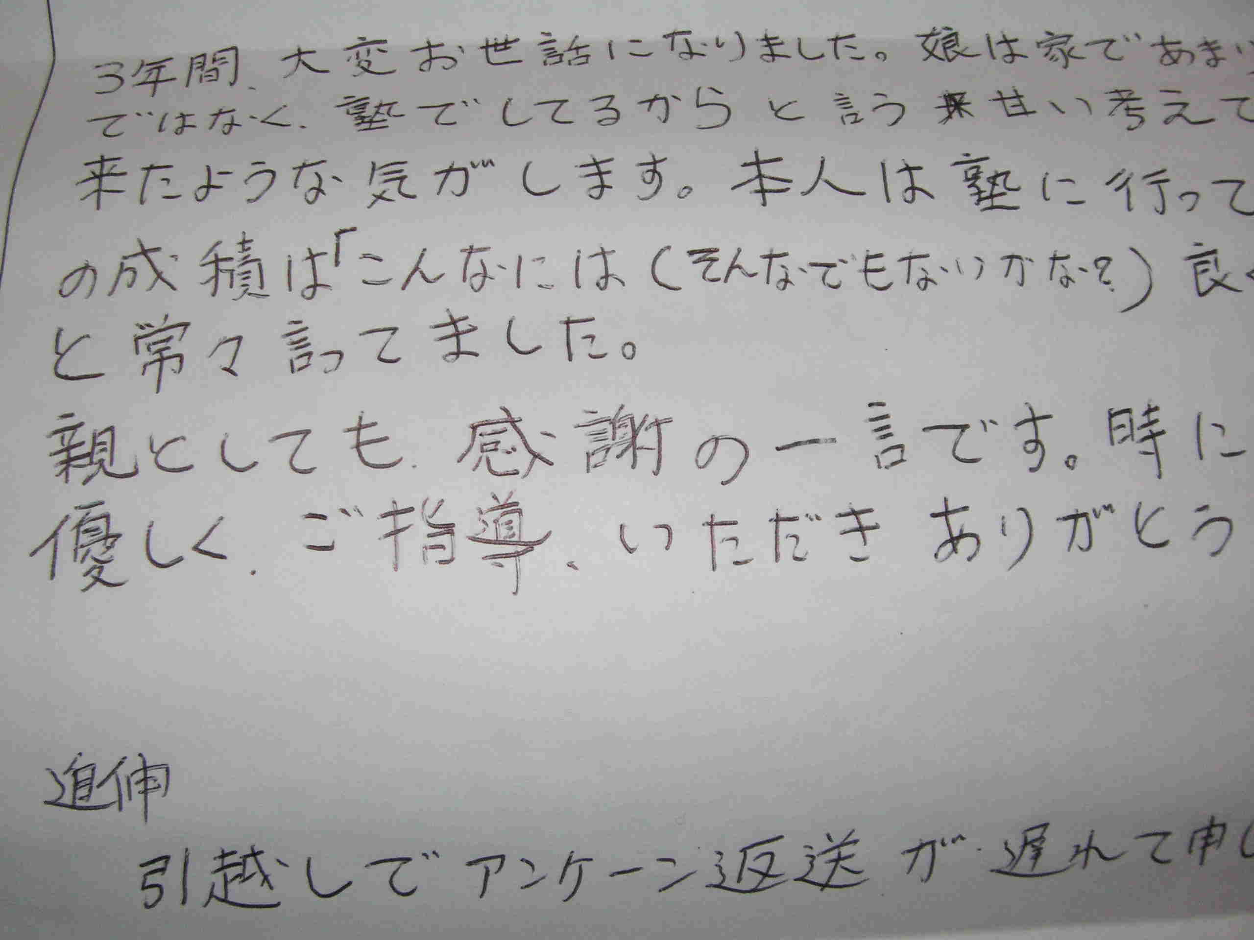 | 名前が書かれているため写真はありません。 | Dさんお母さま 2年間、お世話になりありがとうございました。 友人も一緒だったためか塾に行くことをいとわず前向きに通い続けていました。 塾長先生が理数系ということで、この二教科に関しては安心してお任せしていました。 娘の弱点も指摘していただき大変ありがたかったです。 塾に通うことで問題を多くこなすことができたと思います。 国語、社会などはもう少し一日の授業時間が長ければと思います。 志望校について相談させていただき、データそいただけたことも心強かったです。 データを渡せるまで待つかどうかは別にして三者面談の機会を早めに設けていただくのもよいかと思います。 テスト当日の朝早くテスト対策をしていただくなど先生の生徒達に対するお気持ちを随所に感じることができ、娘も先生を頼りにしておりました。 今後もご相談に伺うこともあるかもしれませんが、どうぞアドバイスのほどよろしくお願いいたします。 |