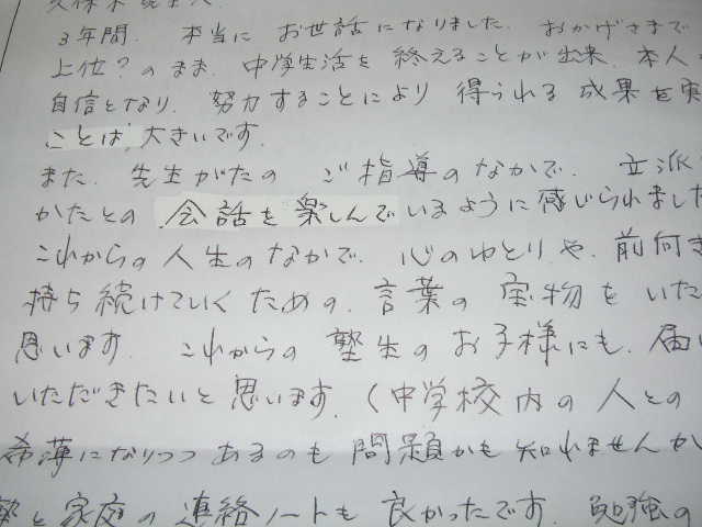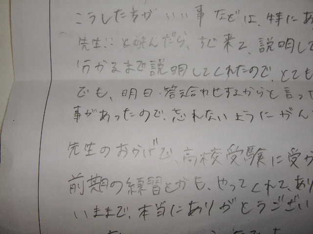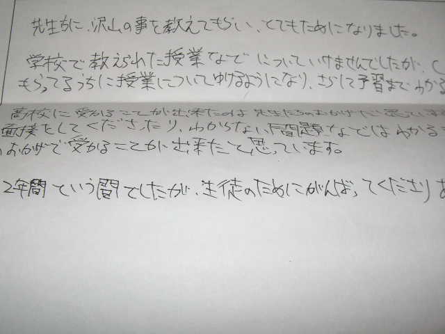 | 名前が書かれているため写真はありません。 | 女子生徒さんのお母さま この度、無事に念願の公立高校に合格することができました。 本当にありがとうございました。 先生と保護者の面談についてですが、できれば学校と平行して 1学期、2学期 保護者全員と面談する時間を設けていただけると良いと思います。 早い時期に子供に合った高校を助言いただけると嬉しいです。 |