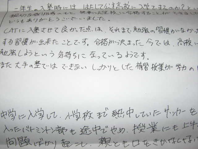 | (男子生徒Bさん) 先生方に沢山の事を教えてもらいとてもためになりました。 学校で教えられた授業などについていけませんでしたがCATで教えてもらっているうちに授業についていける様になりました。 高校に受かることができたのは先生達のおかげだと思います。 面接をしてくださったり、分からない問題などはわかるまで教えてくださり、そのおかげで受かることができたと思います。 約2年間という間でしたが、生徒のためにがんばってくださってありがとうございます。 |