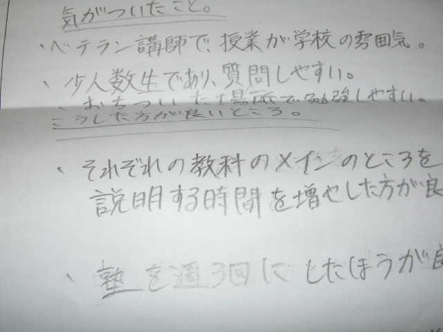 (女子生徒 I.Mさん) 気が付いたこと!・・・・・ ・ベテラン講師で授業が学校の雰囲気。 ・少人数制で質問しやすい。 ・おちついた場所で勉強しやすい こうしたほうが良いところ・・・・ ・それぞれの教科のメインのところを黒板で詳しく説明する時間 を増やしたほうがいい ・塾を週に3回にしたほうがいい ・社会や理科は覚えることがたくさんあるのでゴロ合わせをもっともっと多く作って生徒達に教えてあげたら便利かも ・一人ずつの面談の時間を設けたほうがいい(アドバイス、高校のことなど) ・宿題チェック表を作ったら便利(出された宿題をメモするやつ。宿題がなんだったか忘れる人もいるので) |