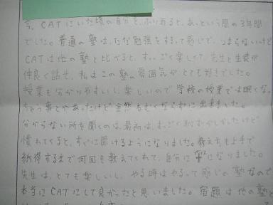 | 今、CATにいた頃の自分を振り返るとあっという間の3年間でした。 普通の塾は、ただ勉強するって感じで、つまらないと思うけどCATは他の塾と比べると、 すっごく楽しくて先生と生徒が仲良く話せ、私はこの塾の雰囲気がとても好きでした。 授業もわかりやすいので学校の授業では眠くなっちゃう事とかあったけど全然眠くならずに出来ました。 分らないところを聞くのは最初はすっごく恥ずかしかったけど慣れてくるとすぐに聞けるようになりました。 教え方も上手で納得するまで何回も教えてくれて自分に+になりました。 先生はとても楽しいし、やる時はやるって感じの塾なので本当にCATにして良かったと思います。 宿題は他の塾と比べると多くて大変だったけど、やった分身についていると言うことが受験の時に わかったので、これからも先生と生徒が仲が良くておもしろい塾にしてください!! 宿題もジャンジャン出してあげてください(笑) 宿題がないと家では勉強しないと思うので←これって私だけカモしれない(ーー;) これからもがんばってください(^<^) また遊びにいきまーす。 ↑ なんか、意味プ〜さんな文でごめんなさい!!! 自分の感想ばっかで・・・・ アンケートになってないかも(泣) 今まで本当にありがとうございました。 |