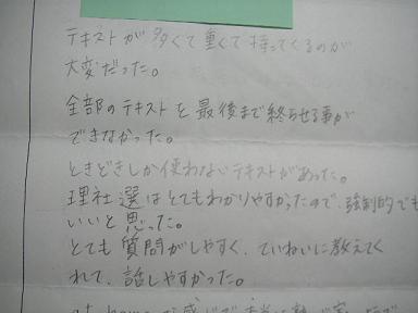 | 宿題が少し多いけど、先生たちは親切で理解できるまで説明 をしてくれる。 とてもたよりやすい先生たちです。 進路を考える時もいろいろ相談にのってくれたり、面談をしてくれました。 試験には面接があるので面接の練習もしてくれました。 こうしたら良かったと思う点は、テキストにではなくノートに書いたほうが良かったと思うことです。 私は時々数学の基本がわからないときテキストを探して見るのは大変だったのでノートをとっていたら 受験勉強にも役に立つしすぐにわかったと思います。 でも、テキストの表紙に重要なことをいっぱい書いていたので役に立ちました。 |