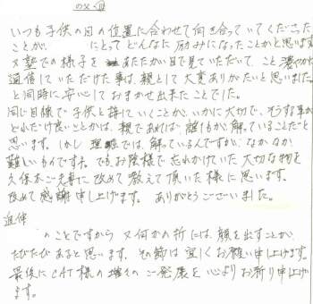 いつも子供の目の位置に合わせて向き合っていてくださったことが、Yにとってどんなに励みになったことかと思います。 また塾での様子をあたたかい目で見ていただいて、こと細やかに通信していただけた事は親として大変ありがたいと思いました。と同時に安心しておまかせ出来たことでした。 同じ目線で子供と接していくことが、いかに大切で、そうする事がどれだけ良いことかは、親であれば誰しもが解っていることだと思います。しかし理屈では解っているんですが、なかなか難しいもんですネ。 でもお陰様で忘れかけていた大切な物を久保木先生に改めて教えて頂いた様に思います。 改めて感謝申し上げます。ありがとうございました。 |