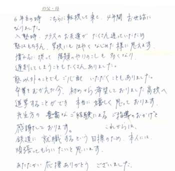 6年生の時、こちらに転校して来て、4年間、お世話になりました。 入塾時、クラスのお友達がたくさん通っていたため、塾はもちろん、学校にもはやくなじめた様に思えます。 慣れるに従って宿題のやりのこしも多くなり、遅刻してしまうこともたくさんありました。 塾以外のことでもご心配いただくこともありました。 卒業をむかえた今、初めから希望しておりました高校へ進学することができ、本当に嬉しく思っております。 先生方の豊富なご経験によるご指導のおかげと感謝しております。これからは、鉄道に就職するという目標のため、本人には頑張ってもらいたいと思います。 あたたかい応援ありがとうございました。 |