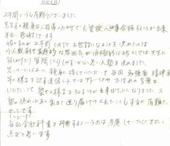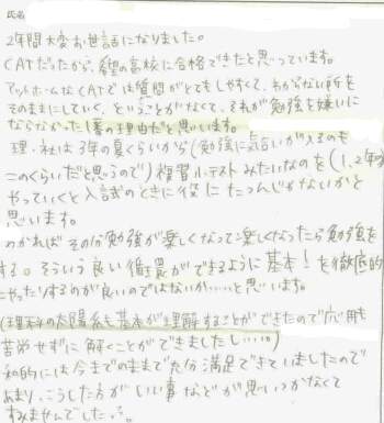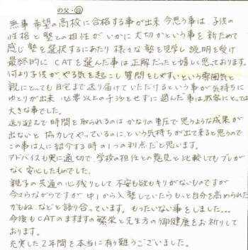 2年間どうも有難うございました 先生方の親身なご指導のおかげで志望校へ無事合格することが出来、本当に感謝しています 娘と私が2年前CATでお世話になることを決めたのは、少人数制で家庭的な雰囲気が、消極的な娘としては先生に話しかけたり質問したりしやすいかなと思い入塾を決めました。 思っていた以上に親身に接していただいて毎回 勉強面、精神面等の様子を記す連絡ノートではアドバイスやおほめの言葉をいただいて、塾での様子を知ることが出来はげみになりました 又塾の終わったあと家まで送り届けてくれたことも本当に有り難かったです 1つだけ、毎回全教科書を持参するというのは考慮していただきたい点だと思います |