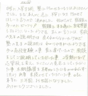 中学に入学する前、塾に行かせるつもりはありませんでした。ただ本人が急に不安になり、行かせてほしいと言うので決めました。 始めてみて、宿題の多いのにビックリ! 宿題をする為に自宅学習もするようになったようです。 本人が言うには、学校の先生の説明では良くわからなかったけれど、塾の先生の説明はわかりやすかったようです。 今の高校受験の事、昔と違っていたので、面談をしてご説明していただいた事、2学期になって志望校を変え、たくさんの意見をしていただいた事、冬期講習を不参加したにもかかわらず、1月より再度来校させていただいた事、etc、本当に三年間お世話になりました。 ありがとうございました。 |