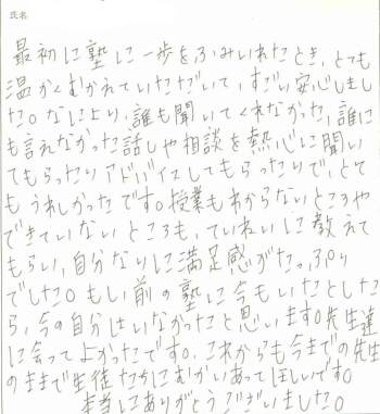 最初に塾に一歩をふみいれたとき、とても温かくむかえていただいて、すごい安心しました。なにより、誰も聞いてくれなかった、誰にも言えなかった話しや相談を熱心に聞いてもらったりアドバイスしてもらったりで、とてもうれしかったです。 授業もわからないところやできていないところも、ていねいに教えてもらい、自分なりに満足感がたっぷりでした。もし前の塾に今もいたとしたら、今の自分はいなかったと思います。先生たちに会ってよかったです。 これからも今までの先生のままで生徒たちにむかいあってほしいです。本当にありがとうございました。 |