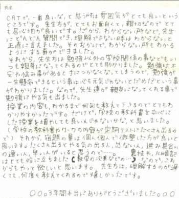CATで一番良いな、と思う所は雰囲気がとても良いというところです。先生方が、とても面白くて、親切なのでとても居心地が良いです。だから、わからない所など、先生にどんどん質問でき、理解できない時はわからないと正直に言えました。そのおかげで、わからない所もわかるようにする事ができました。 それから、先生方は勉強以外の学校関係の事などもいつも親身になってくれるのでとても助かりました。勉強は不安や悩み事があると手につかなくなってしまうので、勉強が一生懸命できるという事は心も元気じゃないとだめだという事がわかりました。なので、先生達が親身になってくれる事で勉強にやる気も出ました。 授業の内容も、わかるまで何回も教えて下さるのでとてもわかりやすかったです。だけど、学校の教科書を中心にした授業を増やしても良いんじゃないかなと思いました。(学校の教科書やワークの内容が定期テストにたくさん出るので) それから宿題の量は個人個人で調整した方が良いと思います。たくさん出るとやる気の出る人、出ない人、進み具合いの遅い人、早い人がいると思うので・・・・・・。裏技や、丸暗記はとても役に立ちました(数学の次乗などの・・・)なので、これからもやって欲しいと思います。先生方は理解するのが遅くても、何度も教えてくれるので嬉しかったです。 ○○○3年間本当にありがとうございました○○○ |