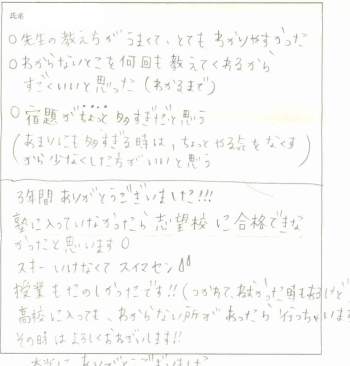 ○先生の教え方がうまくて、とてもわかりやすかった ○わからないとこを何回も教えてくれるから すごくいいと思った(わかるまで) ○宿題が ちょっと 多すぎだと思う (あまりにも多すぎる時は、ちょっとやる気をなくすから少なくした方がいいと思う) ____________________ 3年間ありがとうございました!!! 塾に入っていなかったら志望校に合格できなかったと思います。 授業もたのしかったです!!(つかれてねむかった時もあるけど) 高校に入っても、わからない所があったら行っちゃいます。その時はよろしくおねがいします!! 本当にありがとうざいました |
