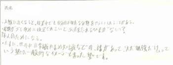 | CATセミナーでは、セミナー卒業時にそれまでの授業の感想・改良希望のアンケートを書いていただいています。 アンケートを通じてC・A・Tセミナーの雰囲気を感じていただけたら幸いです。 |